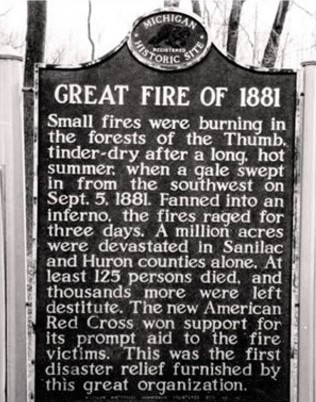 The Red Cross flag flew officially for the first time in this country in 1881 when Barton issued a public appeal for funds and clothing to aid victims of a devastating forest fire in Michigan. The “Thumb Fire” of 1881, burned more than a million acres in less than a day, forcing 14,000 people from their homes, of which 2,000 were destroyed.