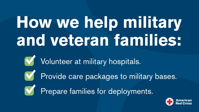 Every day, men and women answer our nation’s call to serve in the armed forces, and the American Red Cross stands by these heroes and their families from the day they enlist throughout their military careers and beyond. These heroes and their families assume great responsibility and face daunting challenges unique to military life, including multiple deployments in faraway locations, lengthy separations from loved ones, and risk of injury and death. Many of the returning service members and soon-to-be veterans suffer injuries to their physical and mental health due to the challenges of their military service. They require assistance and support — as do their families. Red Cross volunteers help prepare for, cope with, and respond to these challenges.